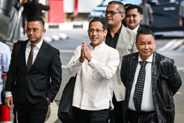Former education, culture, research and technology minister Nadiem Makarim (center) walks with his lawyer Hotman Paris (right) on July 15 upon arriving for an interrogation at the Attorney General's Office (AGO) headquarters in Jakarta. Investigators questioned the former minister as a witness in a corruption case pertaining to the procurement of Chromebook laptops in the then-education ministry. (Antara/Sulthony Hasanuddin)