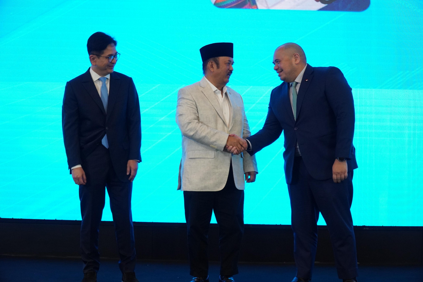 National Development Planning Minister/National Development Planning Agency (Bappenas) head Rachmat Pambudy (center) shakes hands with the Indonesian Fintech Associaiton (Aftech) chairman Pandu Sjahrir (right) on Friday while chairman of the Aftech supervisory board Arsjad Rasjid look on in Jakarta. Bappenas and Aftech launched the Digital × Real Sector Launchpad to push for digital transformation. (Courtesy of Bappenas/-)