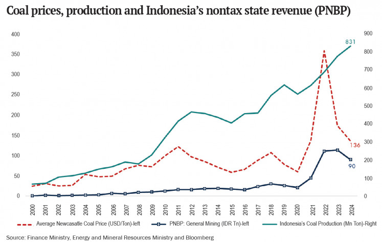 Coal prices, production and Indonesia’s non-tax state revenue (PNBP) (Bank Mandiri/-)This raises a critical question: How did the decline in global coal prices and other factors contribute to Indonesia's 2024 PNBP drop, and what strategies could stabilize revenue?