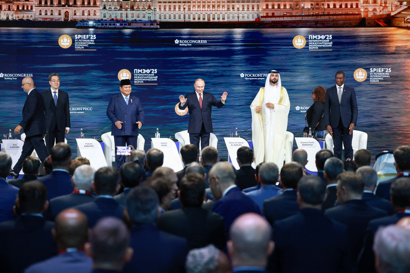 China's Vice Premier Ding Xuexiang (from left), President Prabowo Subianto, Russia's President Vladimir Putin, Bahrain's National Security Advisor Sheikh Nasser bin Hamad Al Khalifa and South Africa's Deputy President Paul Mashatile attend a plenary session of the St. Petersburg International Economic Forum (SPIEF) in Saint Petersburg, Russia, on June 20, 2025. (Reuters/Anton Vaganov)
