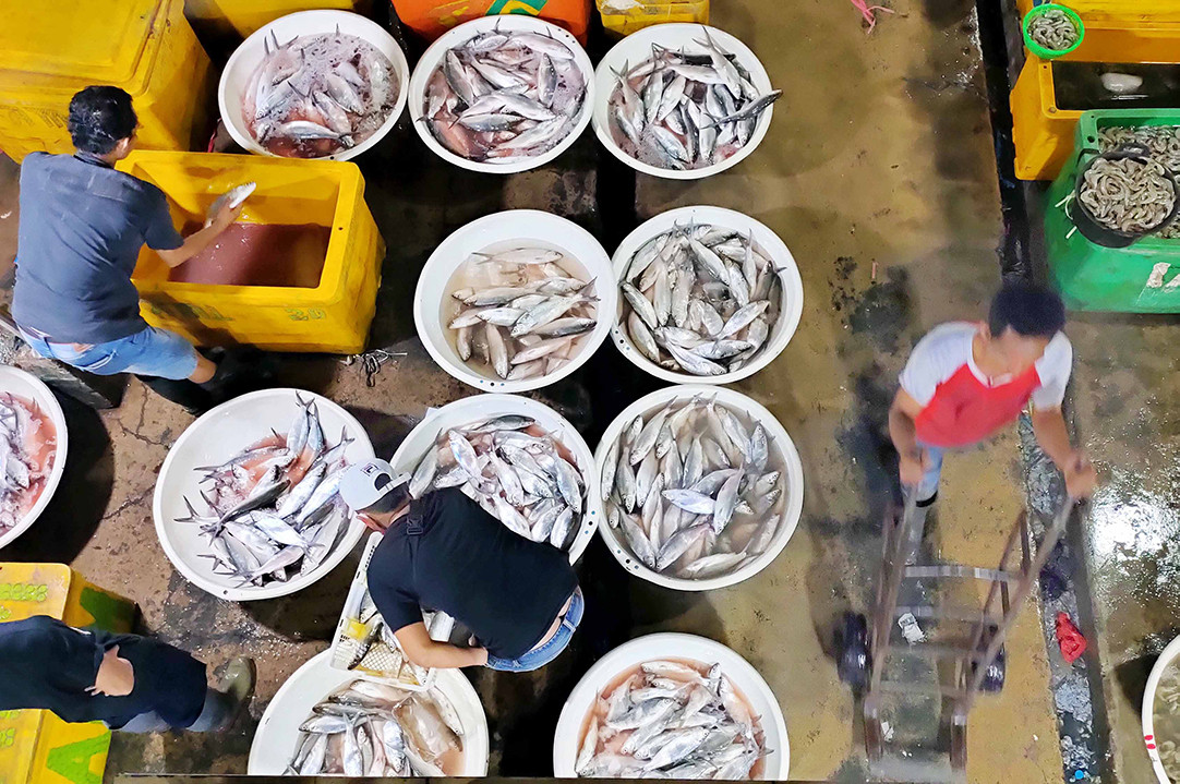 Ebb and flow: Traders sort their catches at the Muara Angke Wholesale Fish Market in North Jakarta on Jan. 23, 2021. The period between December and January is a low fishing season, but fishermen and traders know that these difficult times will not last. (JP/Ricky Yudhistira)