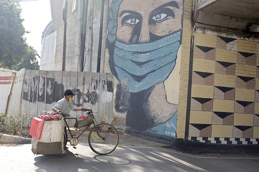 Life goes on: A food vendor pushes his laden bicycle past a coronavirus-themed mural of a health worker in Tebet, South Jakarta on Jan. 9, 2021. The prolonged pandemic does not affect people’s spirit to remain active. (Courtesy of JADIGUNAImages/Jerry Adiguna)