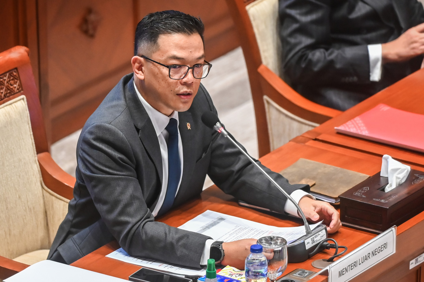 Foreign Minister Sugiono delivers a presentation on Monday during a working meeting with House of Representatives Commission I overseeing foreign affairs and defense at the Parliamentary Complex in Senayan, Jakarta. The meeting discussed geopolitical developments and the protection of Indonesian citizens abroad. (Antara/Rivan Awal Lingga)