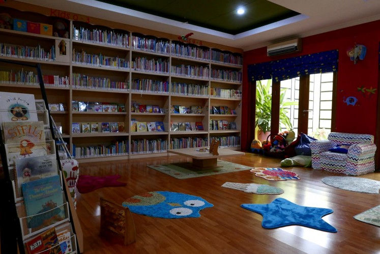 Children's books at Rimba Baca are arranged based on age. (JP/Wienda Parwitasari)The second floor is for adult books of different genres, including fiction, religion, design, parenting, comics and biographies. The books here are also mostly in English, although there is a special section for Indonesian books and comics. People can read on the floor, in chairs or on sofas.