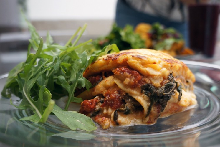 Green veggie lasagna at Dej cafe in South Jakarta. (JP/Jessicha Valentina)Having said that, Dej serves delectable vegetarian dishes, such as sesame-crusted tofu, beet hummus, rainbow frittata, green veggie lasagna, as well as green lentil salad and quinoa veggie marinara, and Talita’s forte, breads and cakes.