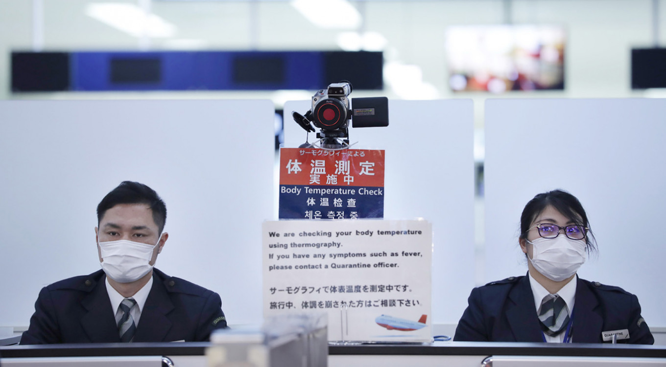 In this picture taken on January 16, 2020, officers work at a health screening station as they observe passengers arriving on a flight from Wuhan, China, where a SARS-like virus was discovered and has since spread, at Narita airport. - The death toll from a new China virus that is transmissible between humans rose to six, the mayor of Wuhan said in an interview with state broadcaster CCTV on January 21, as the World Health Organization said it would consider declaring an international public health emergency over the outbreak. (Photo by STR / JIJI PRESS / AFP) / Japan OUT (AFP/JIJI PRESS)