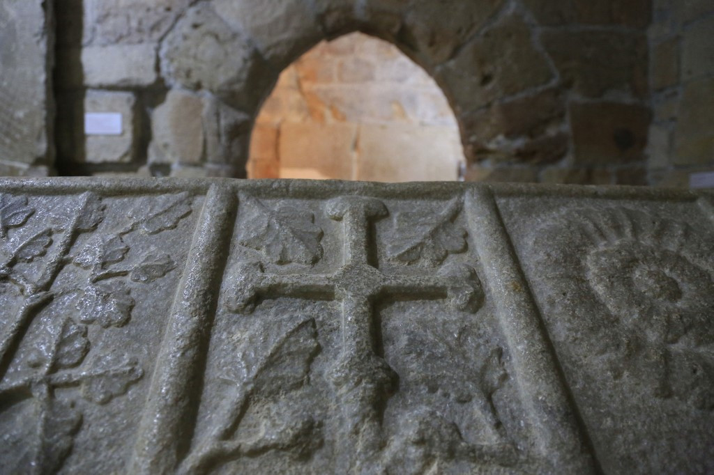 The cross of the Knights Templar engraved on the 14th century sarcophagus of Adam de Antiochia, Marshal of Cyprus, is pictured on January 22, 2021 on the site where a chapel of the Knights Templar was built at the Limassol medieval castle, now housing the Cyprus Medieval Museum in the coastal Cypriot city. Fables of the Knights Templar are legend, but deep beneath a castle on Cyprus -- an island once owned by the Crusader brotherhood -- lies a legacy historians say still resonates today. Down narrow, uneven and steep stone stairs in the fort of the Mediterranean port city of Limassol, in a low-vaulted room lined with tombstones of medieval knights, is the chapel where England's King Richard the Lionheart is believed to have been married, en route to the Crusades in 1192. (AFP/Alex Mita)