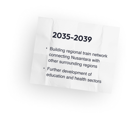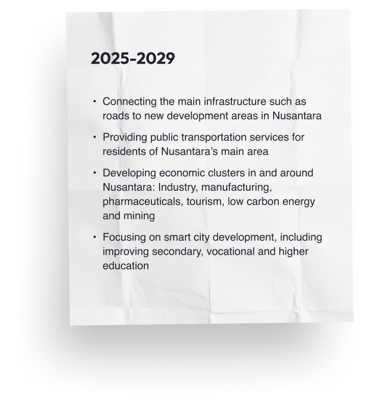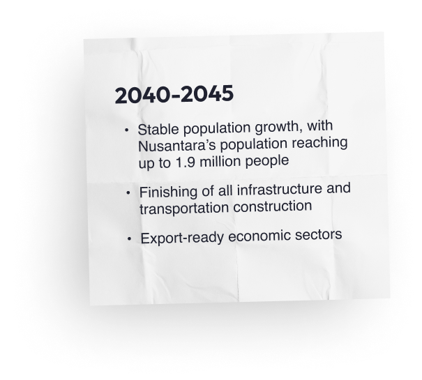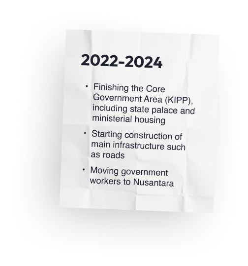 By then, construction is expected to be complete on Nusantara’s Central Government Area (KIPP), the administrative heart of the new capital consisting of the presidential palace, the coordinating ministers’ offices and other key government buildings and housing facilities, ready to welcome thousands of government workers transmigrating from Jakarta.