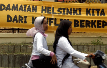 War and peace: Acehnese motorists pass a banner promoting peace on Sept. 14, 2005, in Banda Aceh, Aceh. Under a long-elusive peace deal between Jakarta and the Free Aceh Movement (GAM), observers from the European Union and Association of Southeast Asian Nations monitored the first phase of GAM's disarmament and the pullout of government forces. (AFP/Adek Berry)