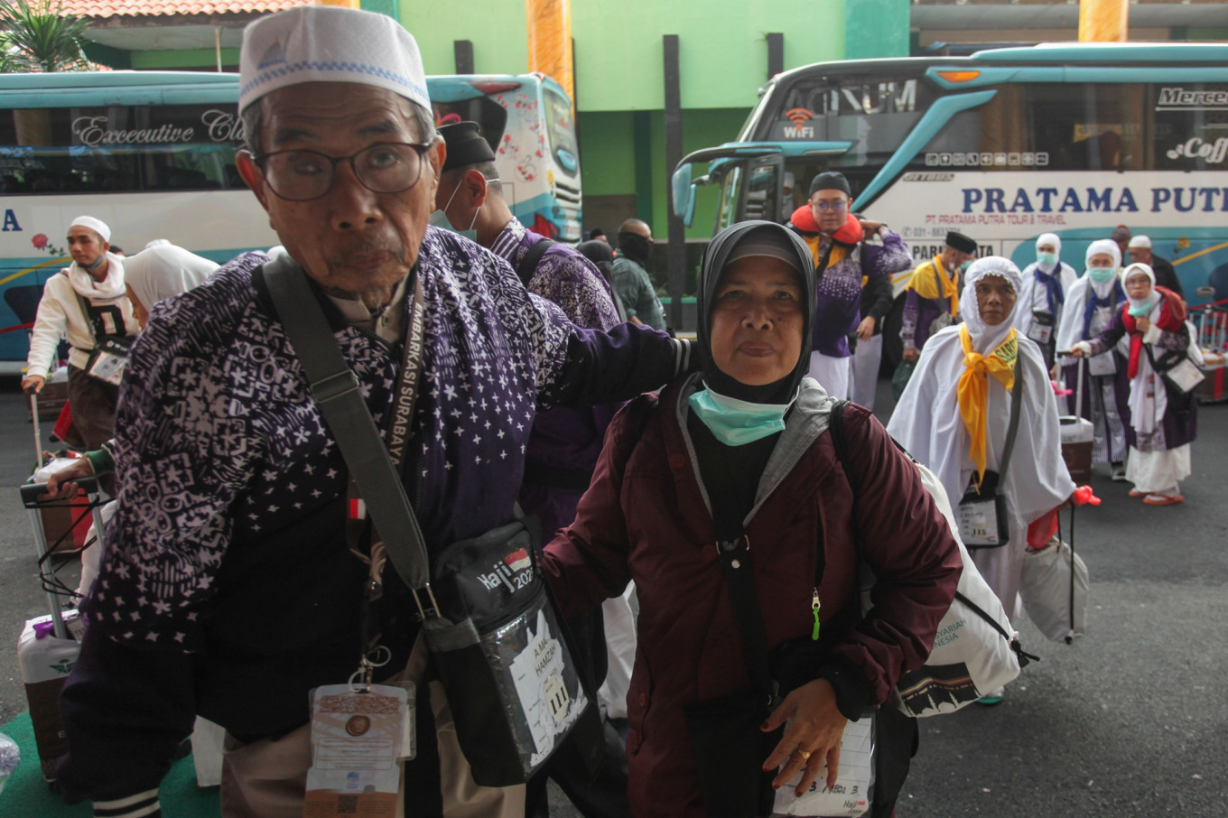 Safe and sound: Pilgrims from the SUB 44 flight group of the Surabaya embarkation point walk into the Sukolilo haj dormitory in Surabaya, East Java, on Wednesday. The pilgrims' flight to Indonesia was delayed after the Muscat International Airport in Oman was temporarily closed following an Iranian attack against an air base in Qatar on June 23. (Antara/Didik Suhartono)