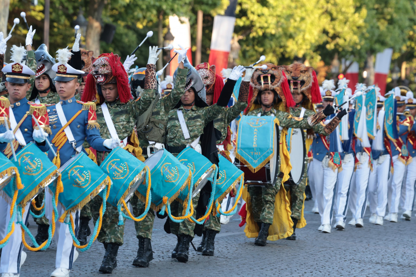 The joint Indonesian Military (TNI) Academy drum band performs during the full-dress general rehearsal for Bastille Day Parade in Paris on Saturday, July 12. The drum band, consisting of cadets from the academies of the three services as well as the Police Academy, is part of the Patriot II Task Force representing Indonesia as the guest of honor at the French National Day parade. (Courtesy of Defense Ministry/-)