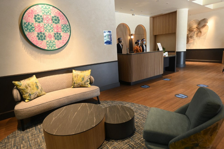 Staff members stand behind the desk of the reception lobby of the Connect@Changi, billed as the world's first coronavirus-safe hotel and conference complex is pictured in Singapore on February 18, 2021. (Agence France Presse/Roslan Rahman)The complex will initially have 150 guest rooms which will later be expanded to 660, each with a shelf outside where staff can leave meals without coming into contact with guests.