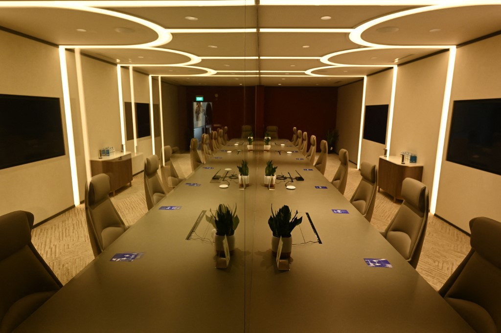 Initially, the centre will have 40 meeting rooms where the visiting executives are separated from those they are meeting by glass panels and communicate via intercom to cut transmission risks.