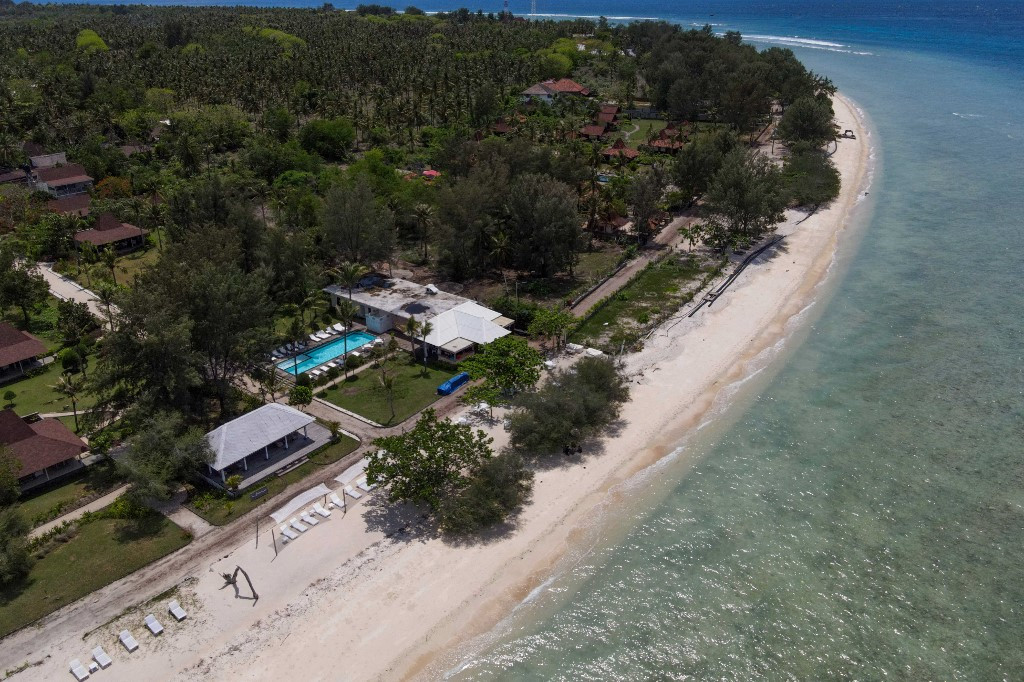 This aerial picture taken on November 22, 2021 shows an empty beach on Gili Trawangan resort island. The coronavirus pandemic has shuttered almost all the resorts and restaurants across Indonesia's Gili Islands, famed for their turquoise waters, sandy beaches, and diverse marine life. (AFP/Bay Ismoyo)