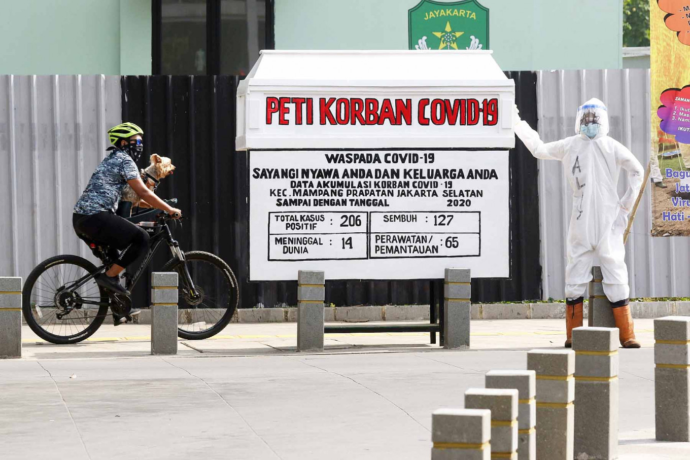 A cyclist rides by a fake coffin guarded by a mannequin dressed in protective gear in Kemang, South Jakarta, on Aug. 17. The display is part of a campaign to raise awareness about the dangers of COVID-19. JP/Dhoni Setiawan
