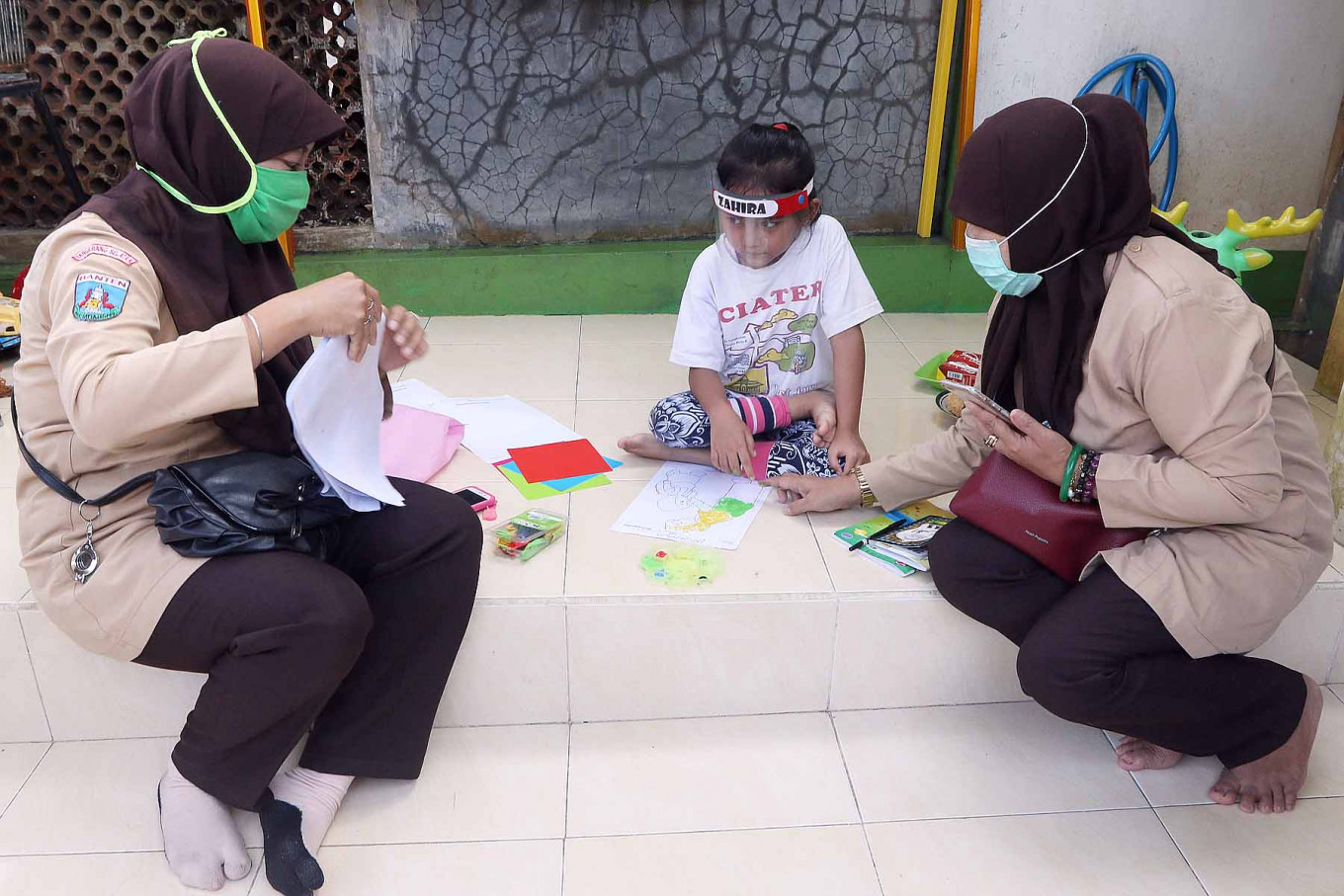 Teachers from the Al Amanah kindergarten in South Tangerang, Banten, pay a teaching visit to a student’s home on Aug. 19. Aside from visiting their students’ homes once every two weeks, the teachers have also organized online classes since the start of the COVID-19 outbreak. JP/Dhoni Setiawan