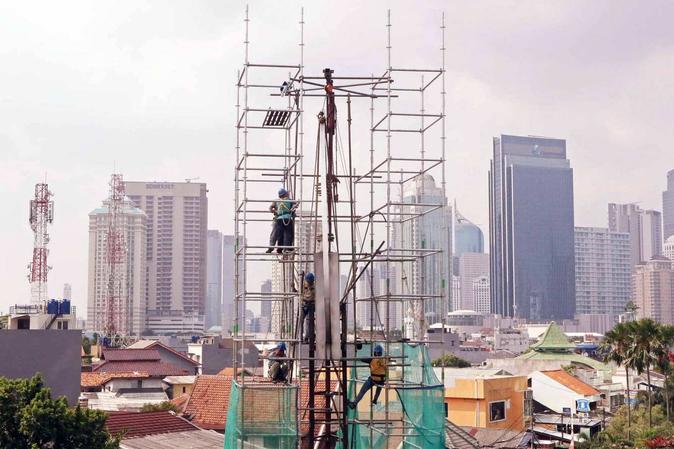 Workers set up a structure for a billboard in Sudirman, Central Jakarta, on Aug.19. The Indonesian Advertisers Association (Appina) said that the COVID-19 outbreak had resulted in an increase in advertisement placements on digital media. JP/Dhoni Setiawan