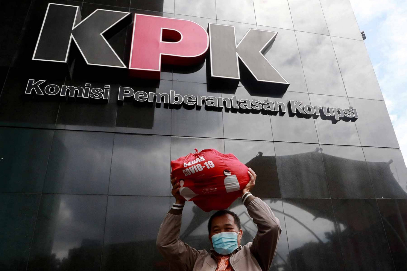 Indonesian Anti-Corruption Community (MAKI) coordinator Boyamin Saiman brings a social aid package worth Rp 188,000 (US$13.35) to the Corruption Eradication Commission (KPK) headquarters in Jakarta on Dec. 16. He handed over the package to the graft busters as evidence for the KPK’s investigation into a suspected bribery case pertaining to the COVID-19 social aid procurement. The antigraft body has named Social Affairs Minister Juliari Batubara a suspect in the case. JP/Dhoni Se...