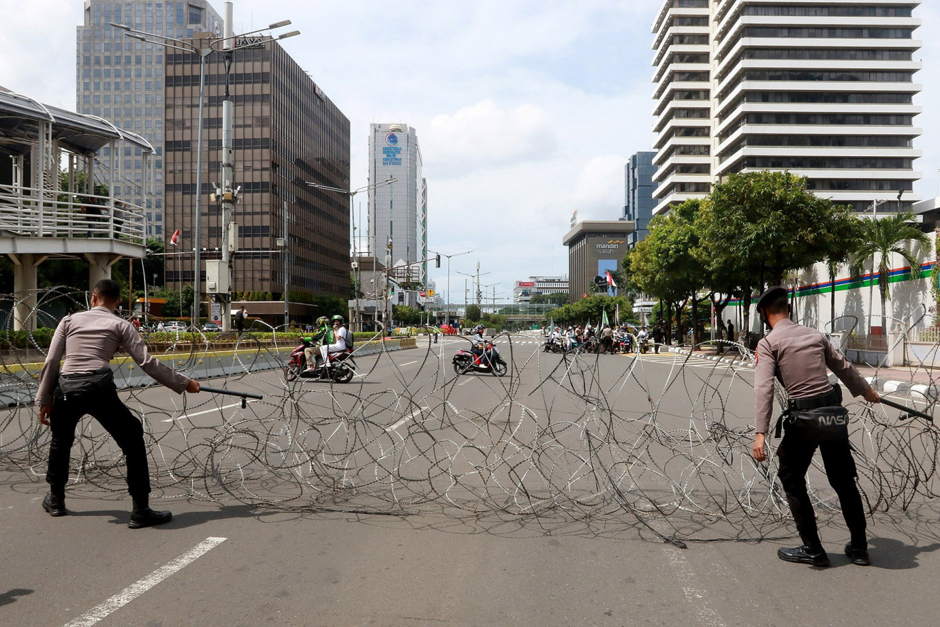 Police officers cordon off streets near the French Embassy in Jakarta on Oct. 30 in anticipation of demonstrations against French President Emmanuel Macron for his comments over Prophet Muhammad cartoons. JP/Dhoni Setiawan