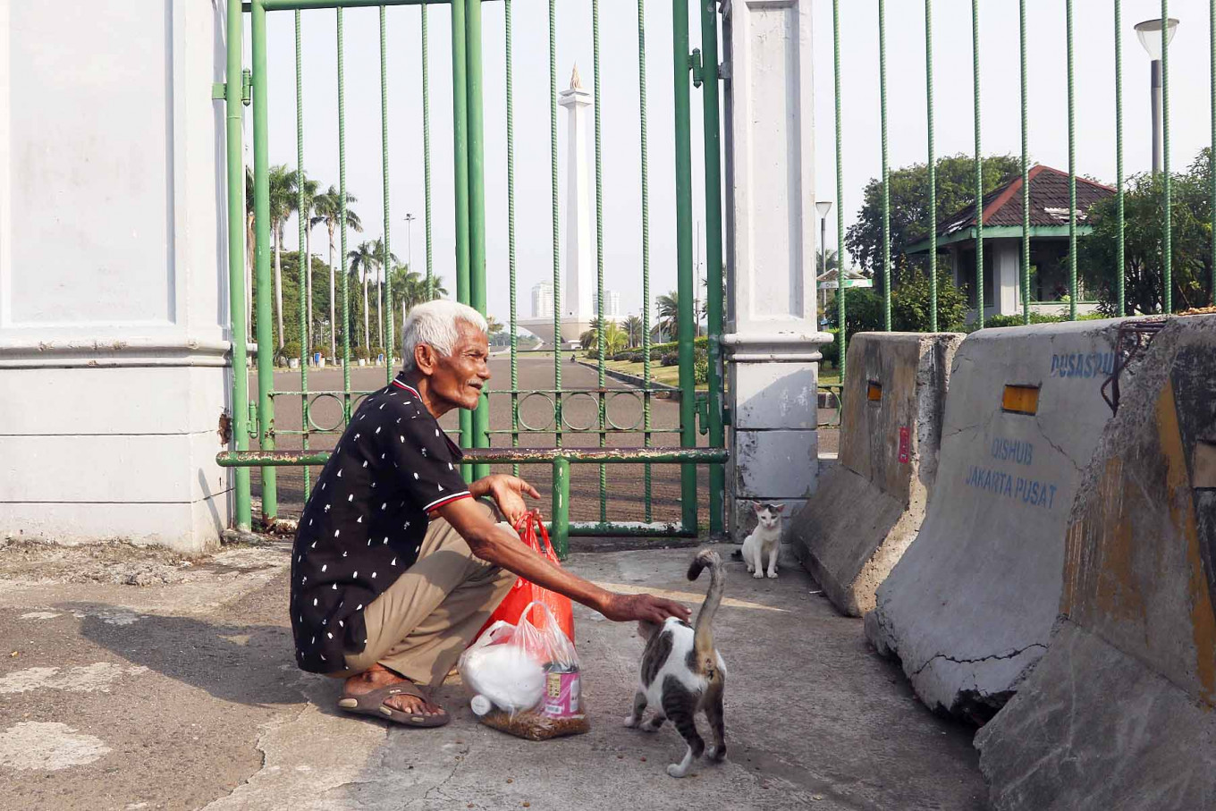 Pendi, 72, feeds stray cats outside the National Monument (Monas) complex in Central Jakarta, on September. 2. 2020 Every week, Pendi receives Rp 70,000 (US$4.74) from a donor to buy cat food and feed around 150 stray cats in the area. JP/Dhoni Setiawan