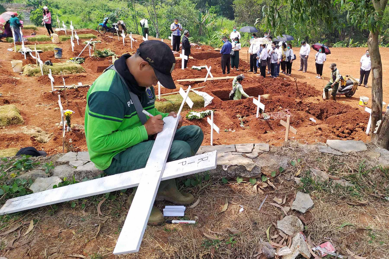 A grave digger writes the name of a deceased COVID-19 patient on a cross at Pondok Ranggon public cemetery, East Jakarta, on August. 31. 2020, while a burial proceeds in the background. Up to 40 people are buried in the cemetery every day. JP/P.J. Leo