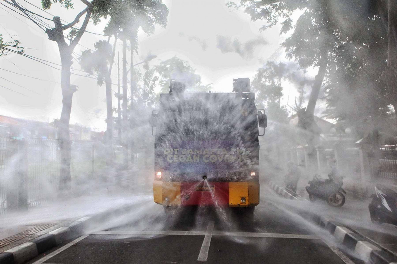 A police water cannon sprays disinfectant in Tebet, South Jakarta, on Nov. 23. The cumulative number of COVID-19 cases in Indonesia has surpassed 500,000. JP/Seto Wardhana
