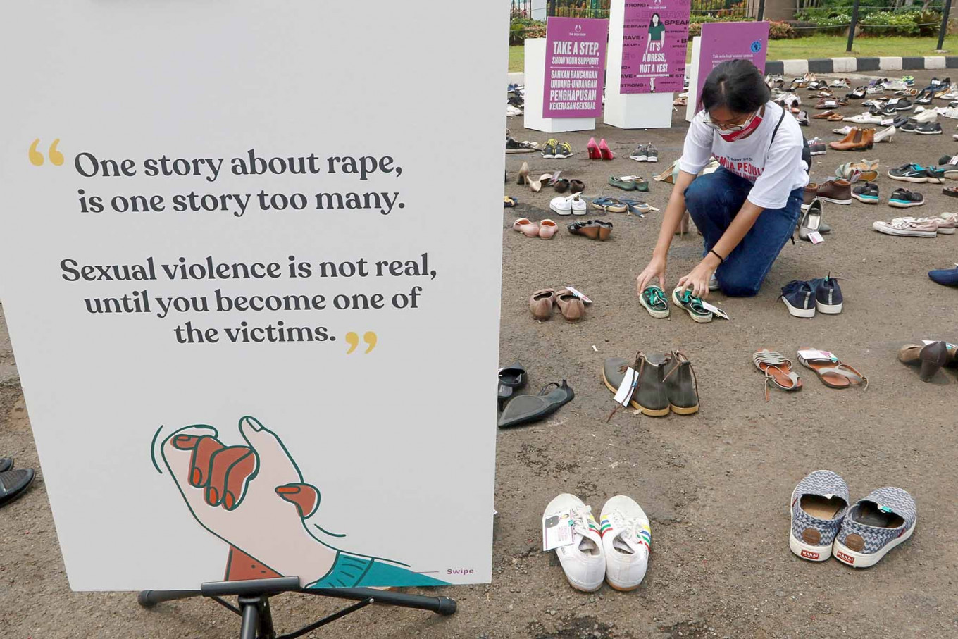 An activist arrange pairs of women’s shoes at the House of Representatives complex in Central Jakarta on Nov. 25. The Shoes in Silence campaign, marking the International Day for the Elimination of Violence against Women, urged lawmakers to pass the sexual violence eradication bill. JP/Dhoni Setiawan